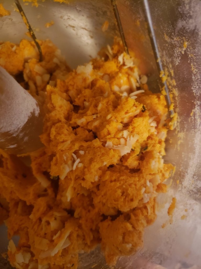 - Add the pumpkin, oil and sage (or milk or cream), 50 grams of the parmesan to the flour and mix just until combined.