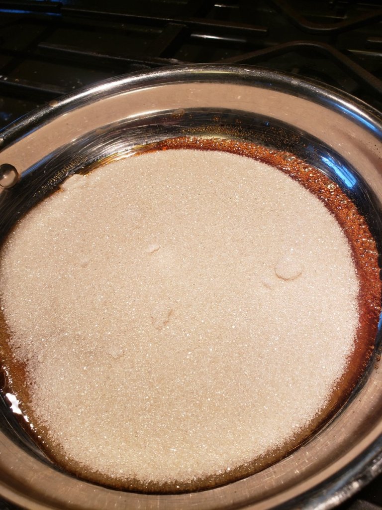 Here is some sugar in a pan. Stainless steel is highly recommended here, because you can clearly see your sugar turning color.