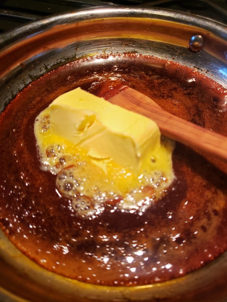 Note that I’m using light brown sugar here. If you use white sugar, don’t let your caramel get this dark.