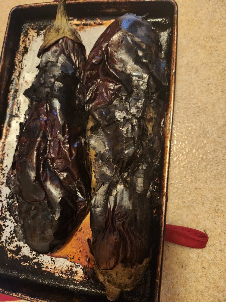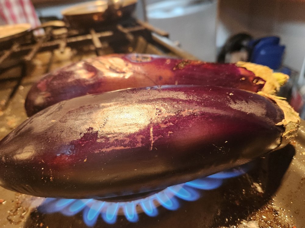 - Char the aubergines. If you have a gas cooker, you can do this over a naked flame. Otherwise, you can use a blow torch if you have one, or use a very hot barbeque grill. With all these methods, you can finish cooking the aubergine in a 200 C (400 F) oven if you think charring it hasn’t quite cooked it through. You want it to be so soft that it collapses under its own weight. If you don’t care about the smoky flavour charring gives, then you can just directly bake the aubergines.