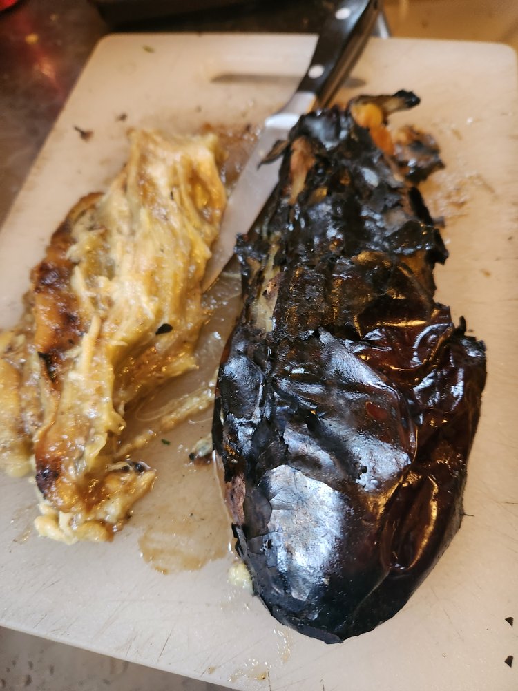 - Peel and discard the charred skin. Briefly drain the aubergine flesh in a strainer (if you want to be fancy, you can first put it in a big bowl of water with some lemon juice so it remains white. I don’t bother with this because I like the darker colour it gets without this step).