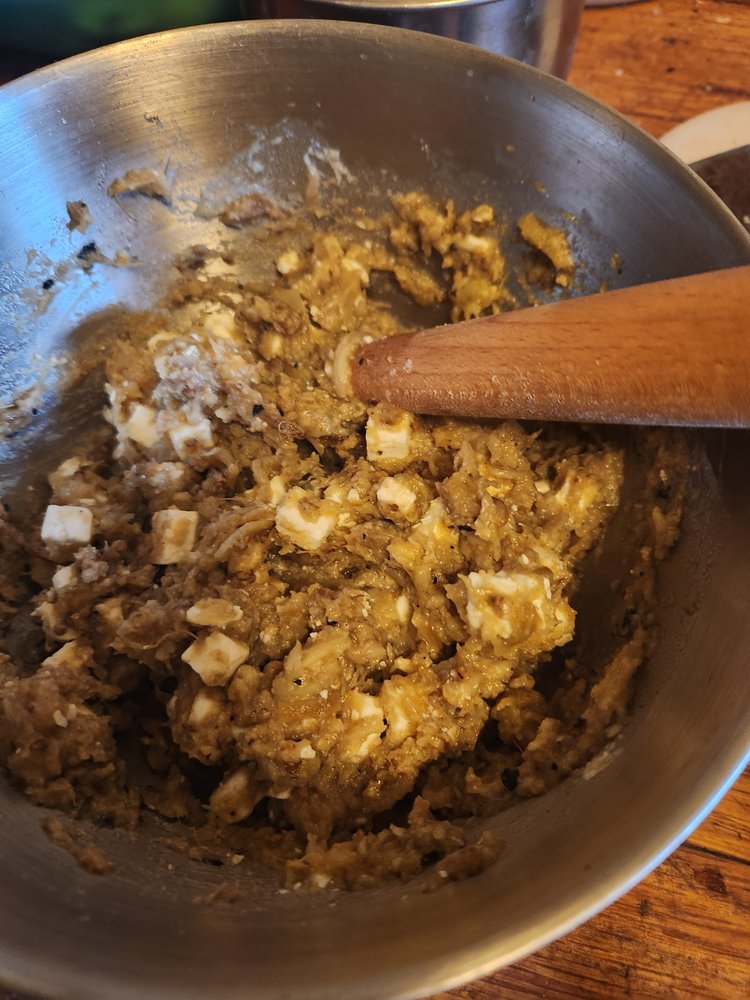 - Let them cool somewhat, then mix them with the feta and dill. Add salt and pepper to taste. If the mixture looks wet, add the bread crumbs or flour.