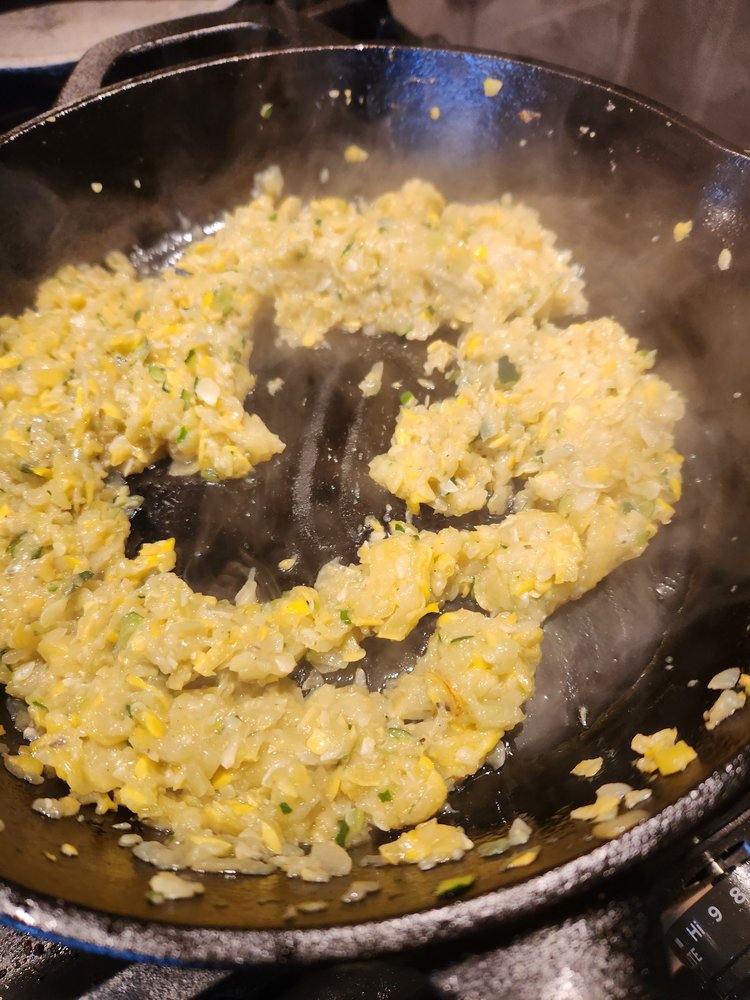 Saute coarsely grated courgette until it’s very soft and does not appear wet.