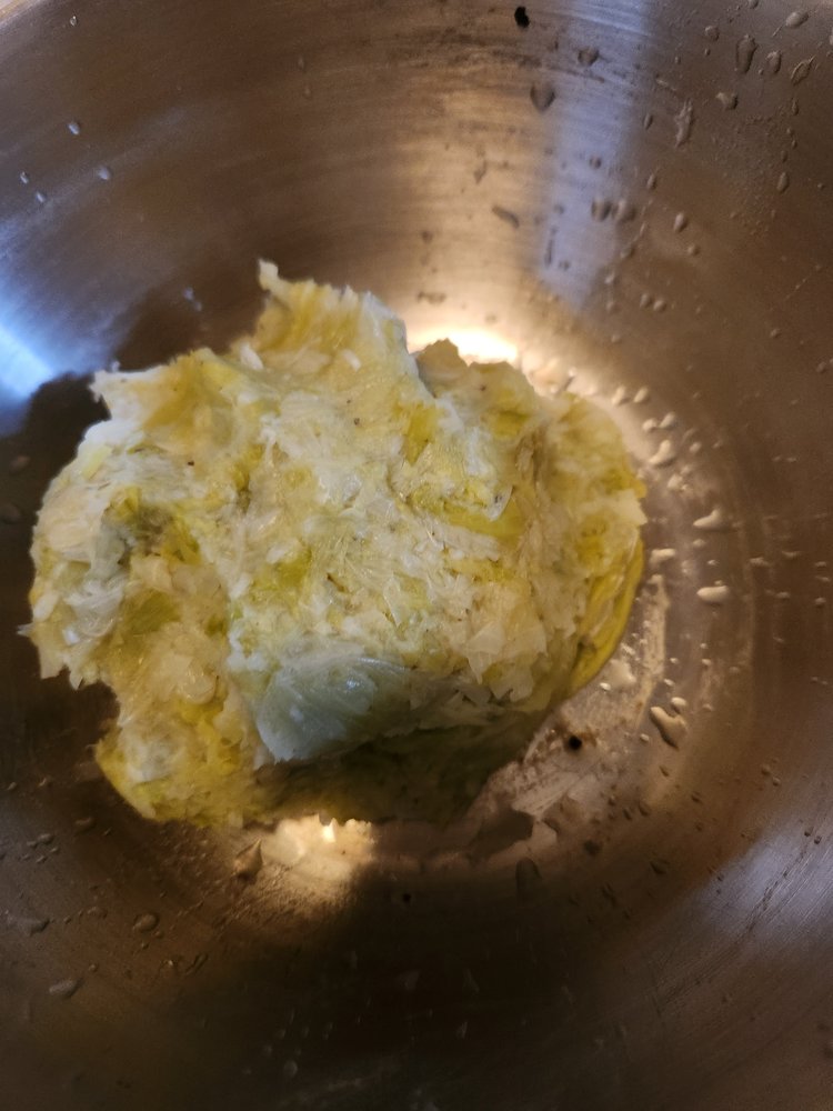 Once it is cool enough to handle comfortably, squeeze the cooked leeks to get rid of excess water.
