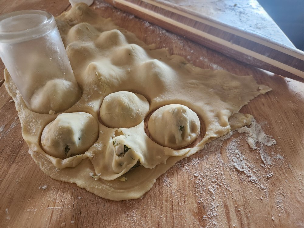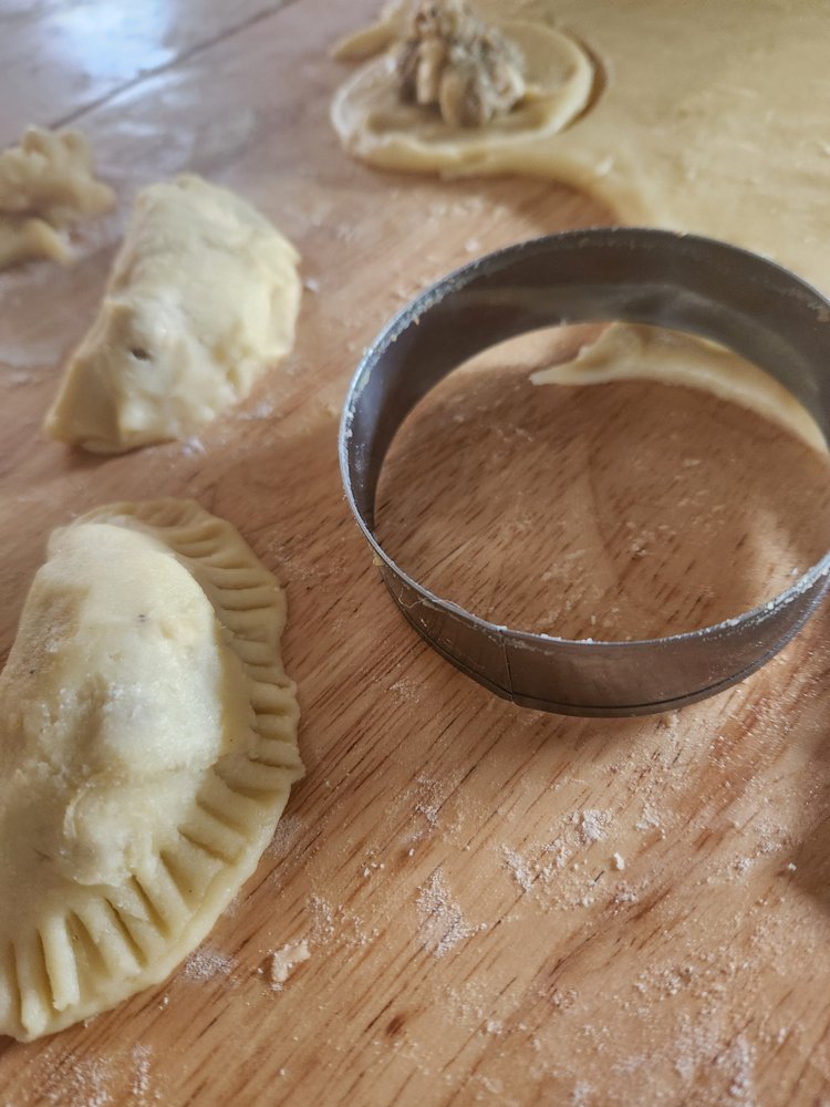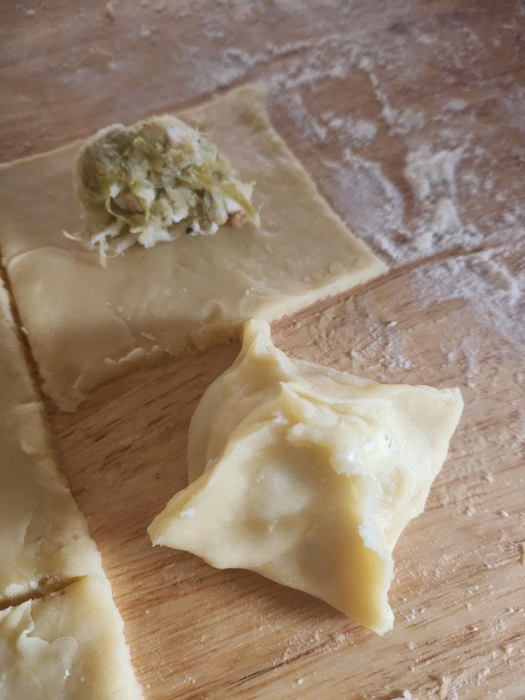 Making finjan style borekitas. This style is traditional for Turkish deep fried hand pies, usually with a ground meat filling. Though not traditional for borekitas, it may be easier to make that the pirozhki shape. Any tears in the dough may be repaired with extra bits of dough from the trimmings. Just tack on the extra dough bits lightly. Ravioli style is similar; you just cut between the piles of filling with a rolling cutter instead of a cup.
